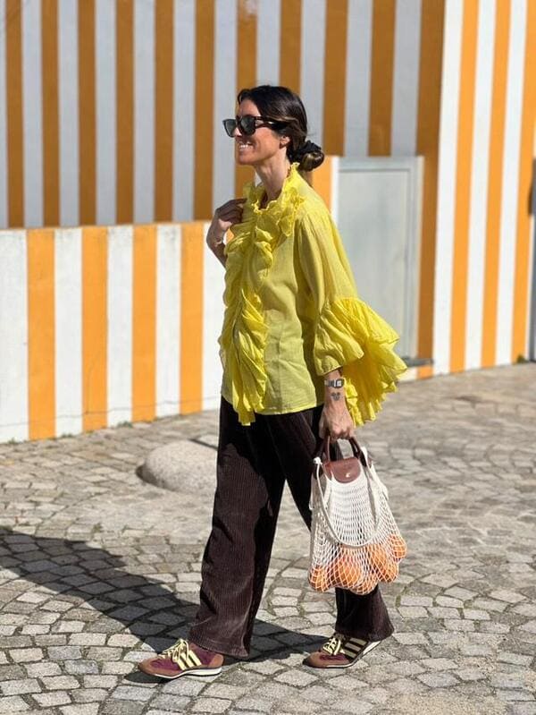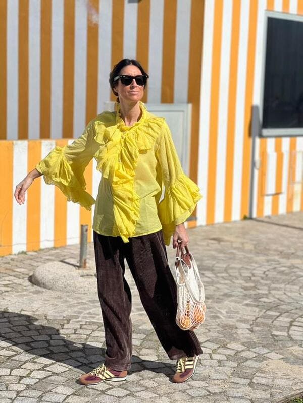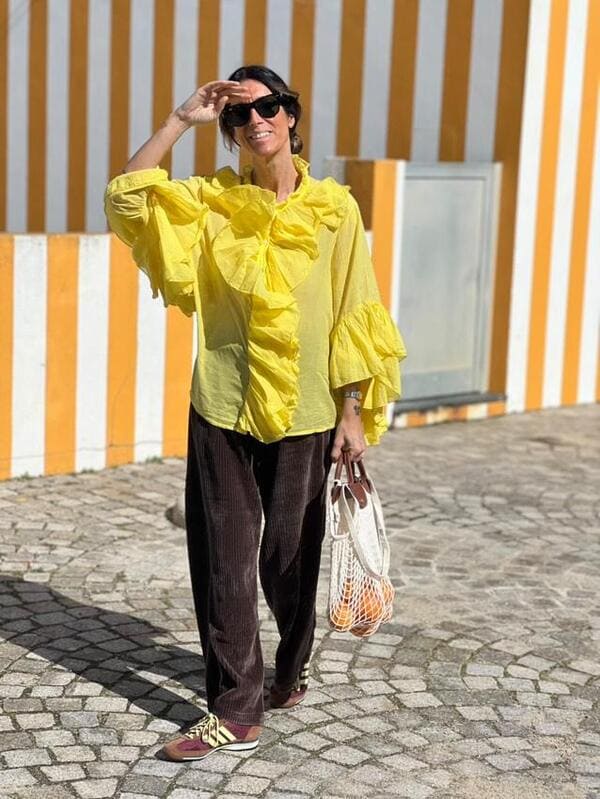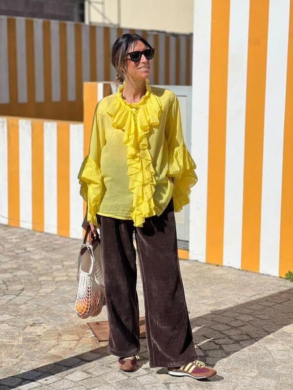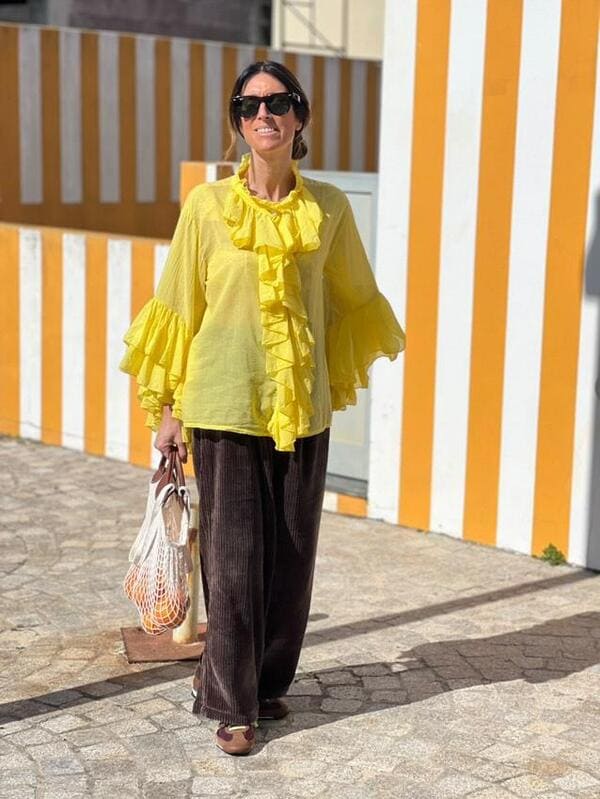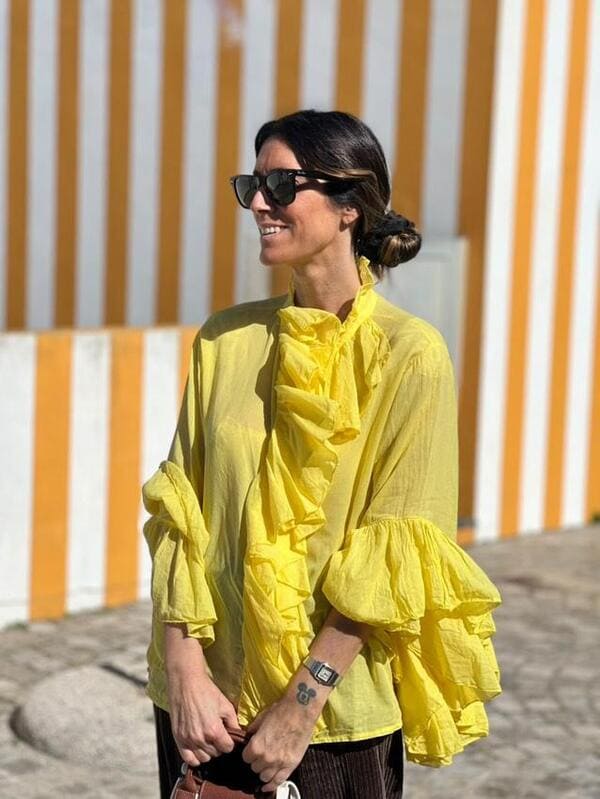 Camisa amarilla con doble volante en manga, cuello y pecho. Cierre con botones de nacar.