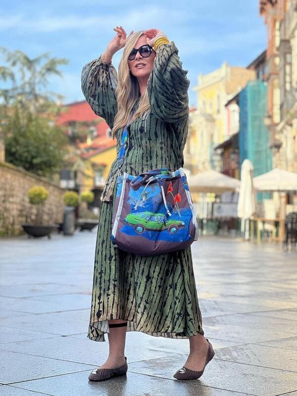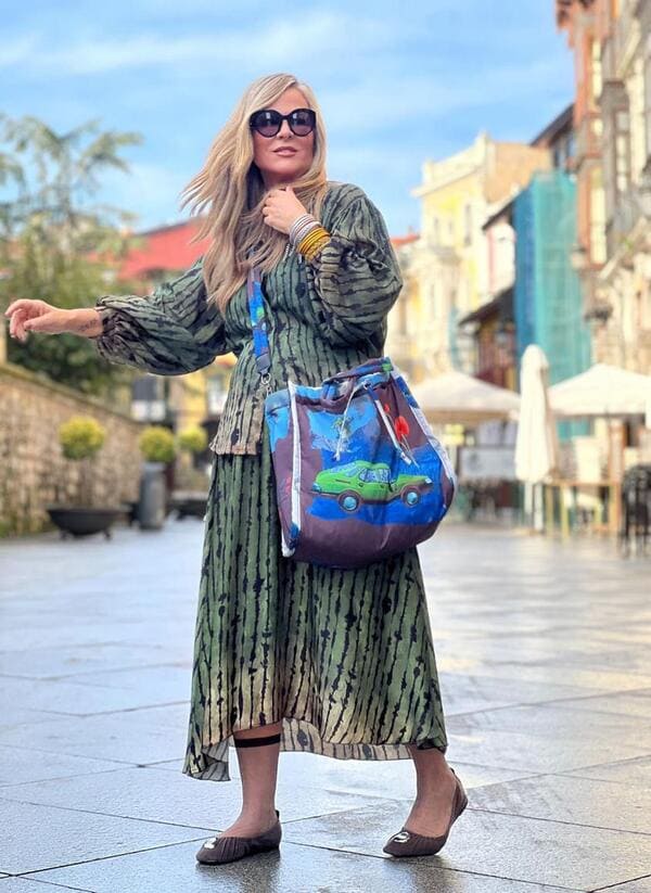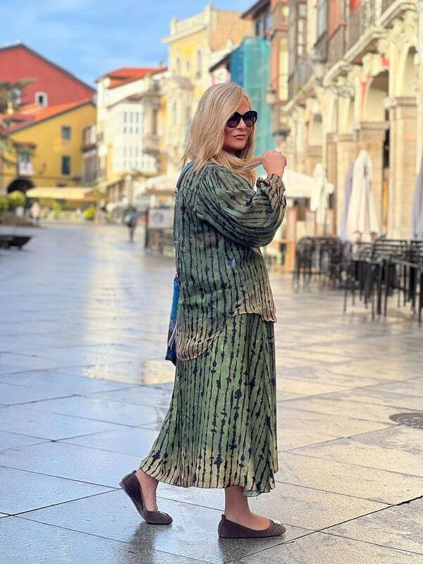 Blusa verde, con trazos negros. Cuello camisero, bajo asimétrico. Manga ancha fruncida.