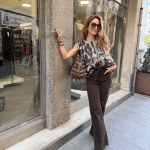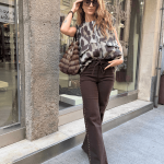 Chaleco print marrón, cuello redondo, cierre con cremallera. Bolsillos delanteros, terminación con goma. Forro al tono.