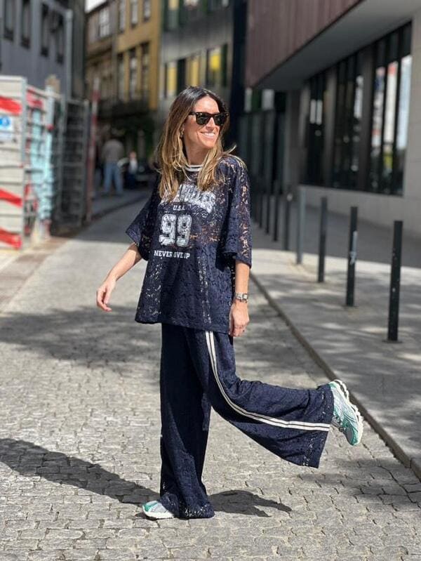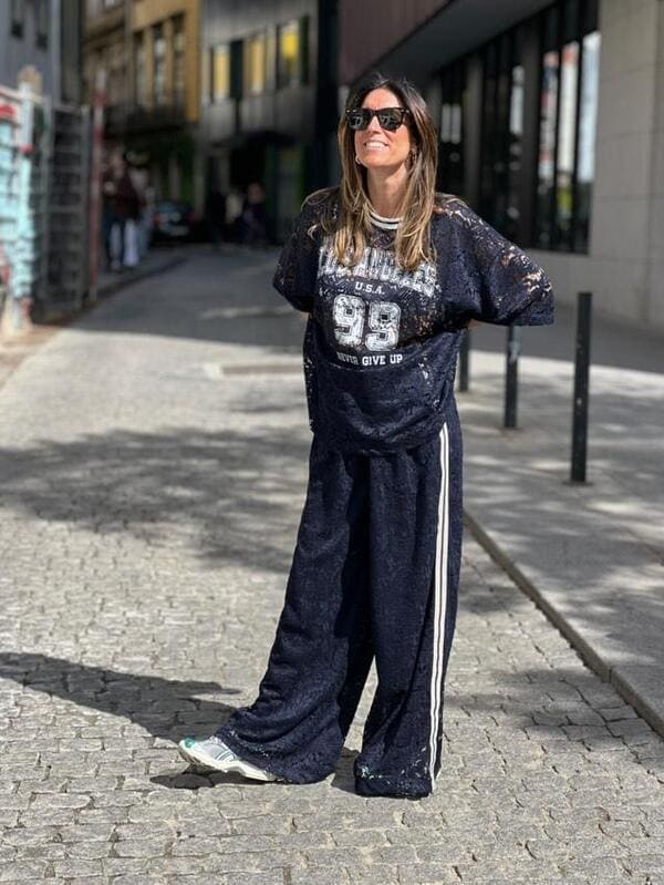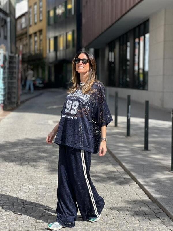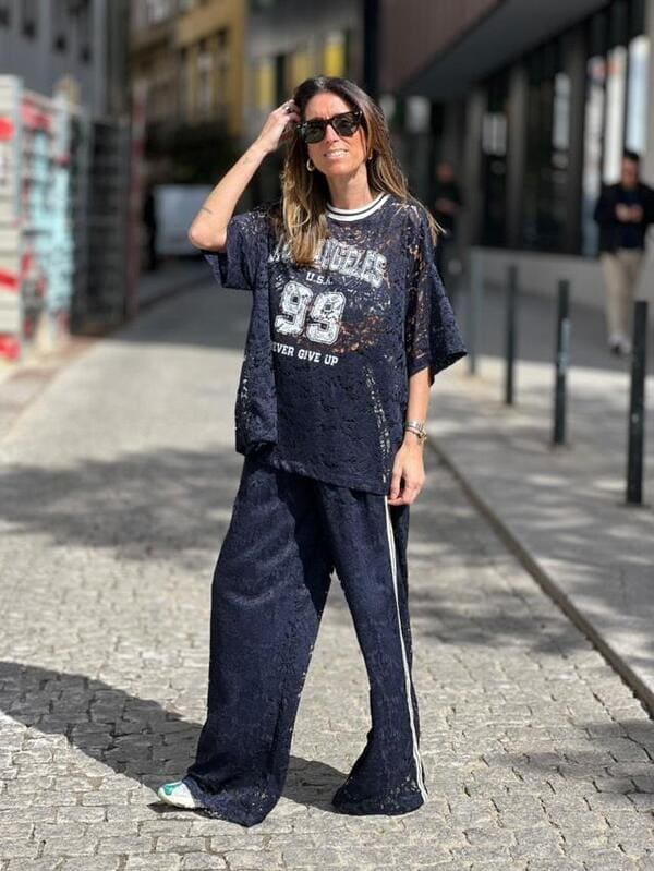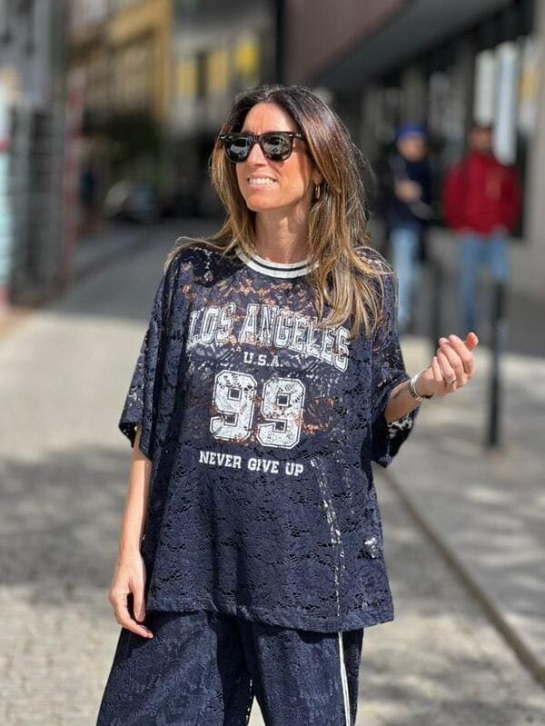 Camiseta encaje azul marino, cuello redondo con ribete y letras en blanco. Manga corta.