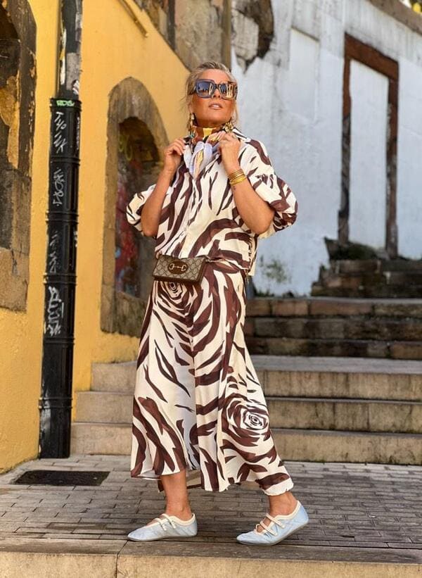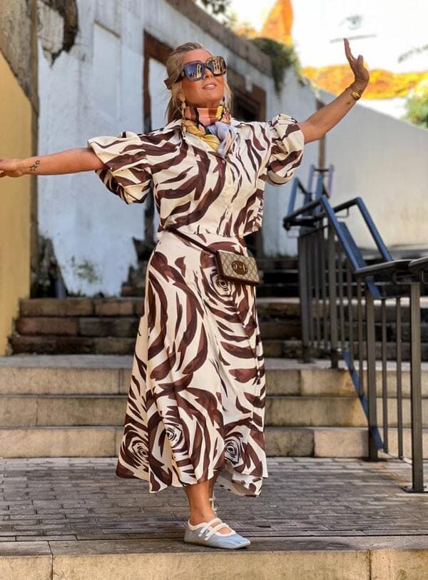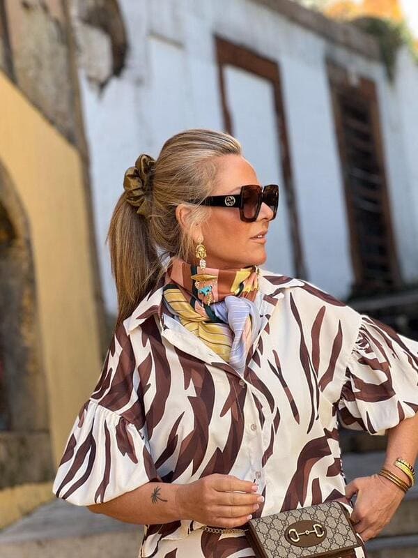 Blusa marrón y beige, corta y cuello camisero. Mangas abullonadas.