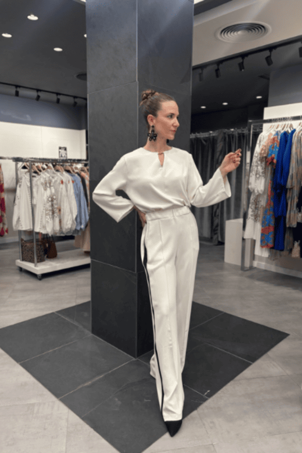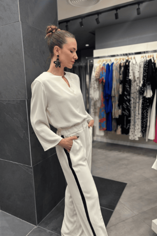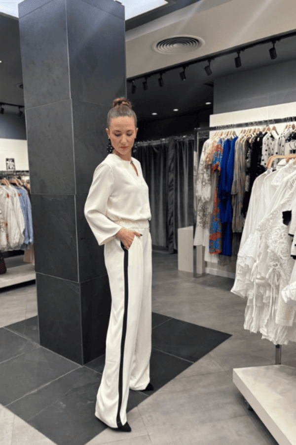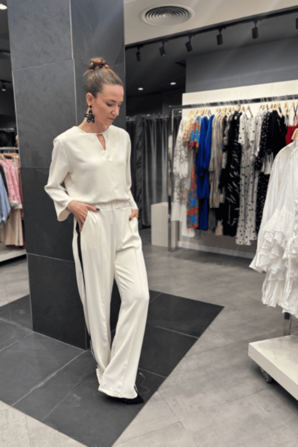Pantalón pata recta, goma en cintura, bolsillos laterales. Franja negra lateral.