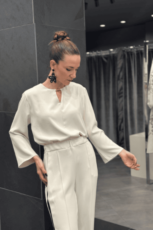 Blusa cuello redondo, adorno dorado. Manga larga.
