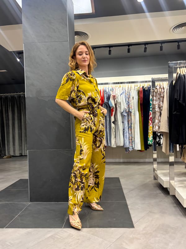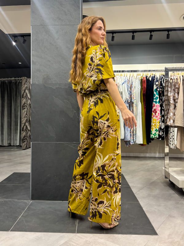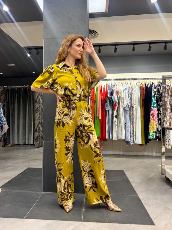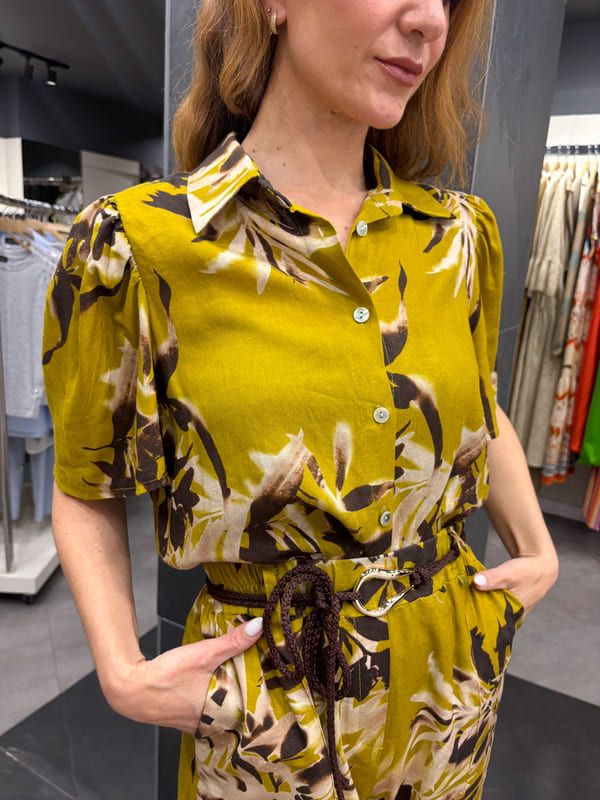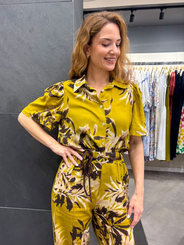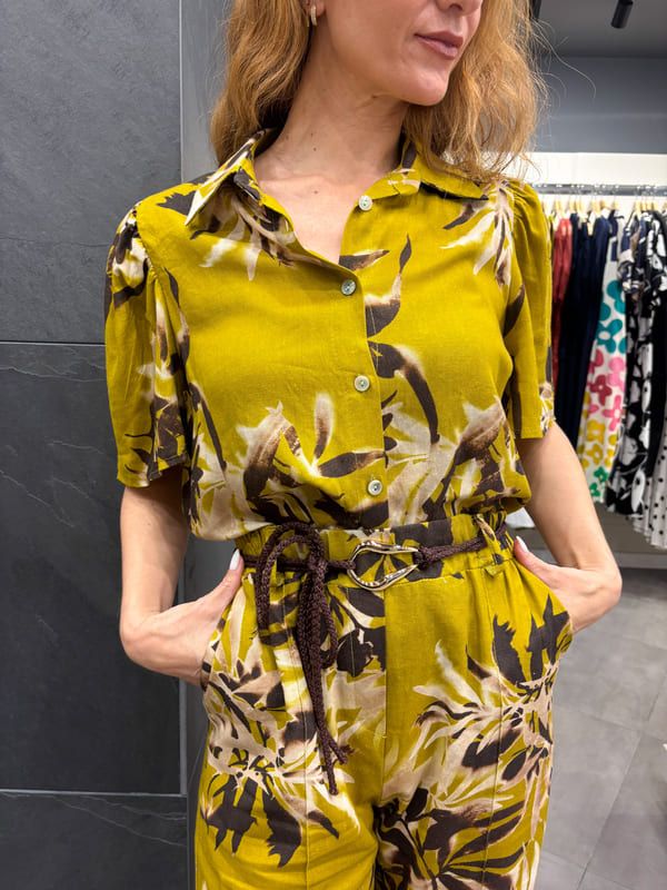 Blusa fondo verde estampado floral en marrón y beige. Cuello camisero, manga corta hombros con pliegues.