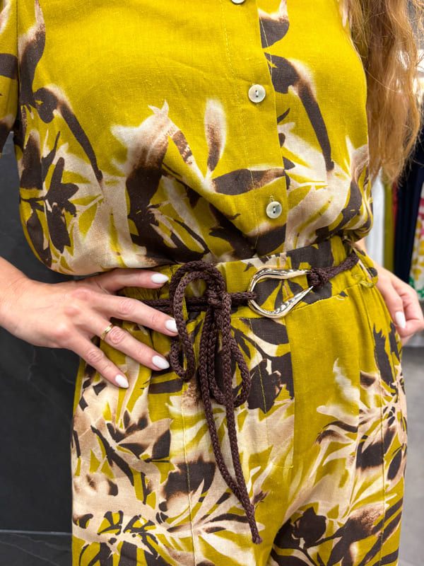 Pantalón pata recta y ancha. Goma en cintura, con pinzas y cintuón marrón.