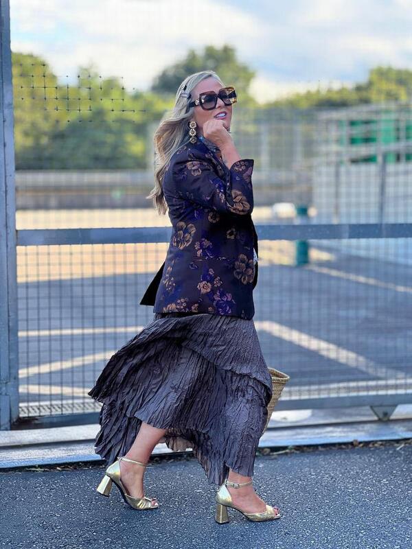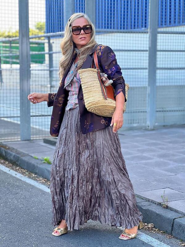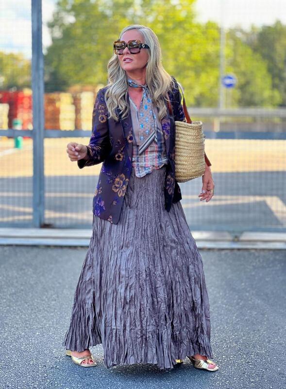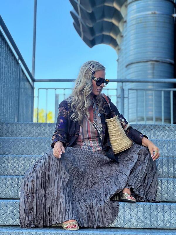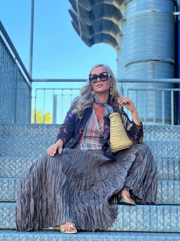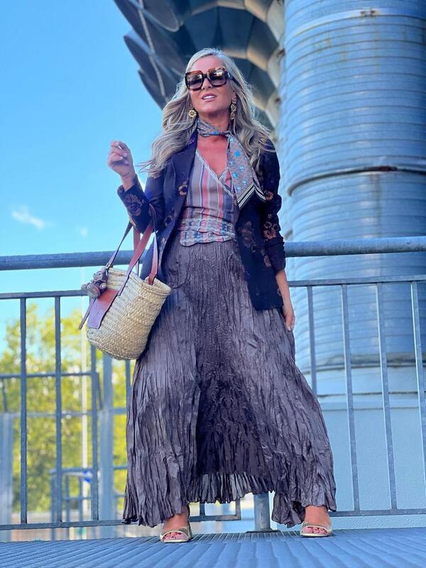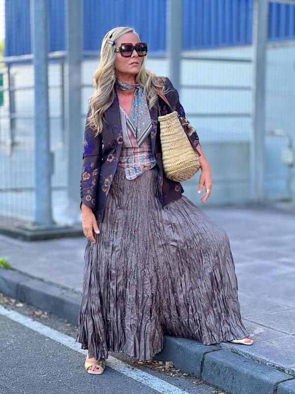 Falda larga, arrugada marrón. Goma en cintura, con vuelo.