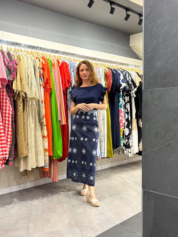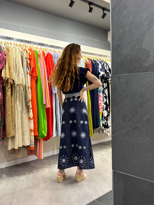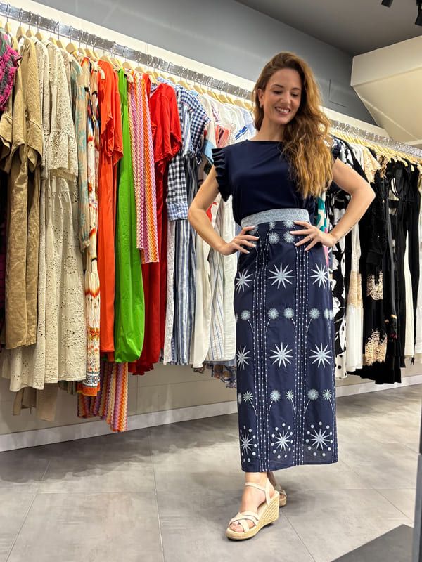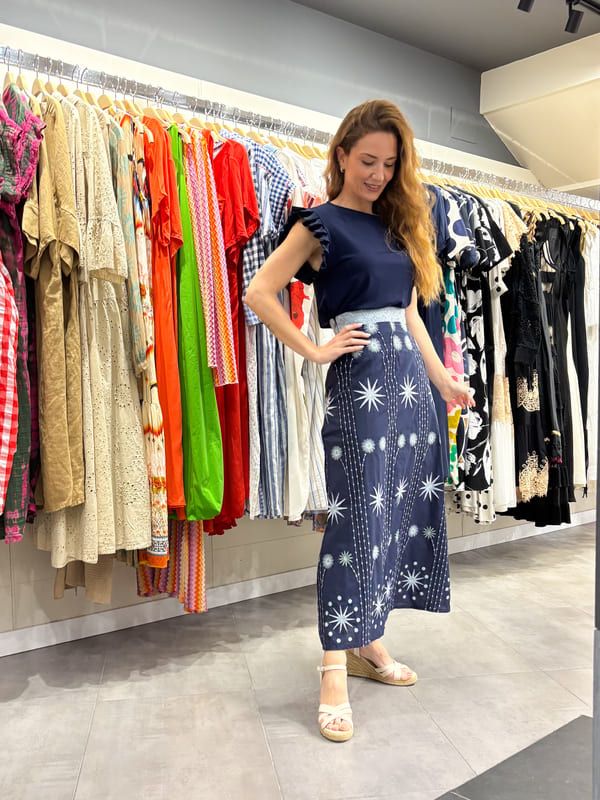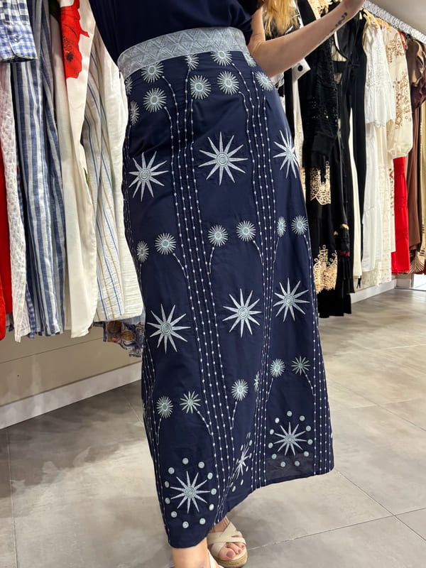 Falda midi azul bordado estrellas. Cintura con pasamanería, cremallera lateral. Forro al tono.