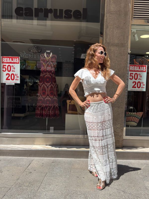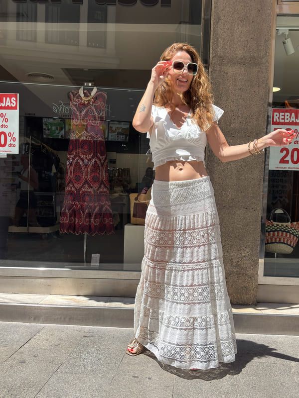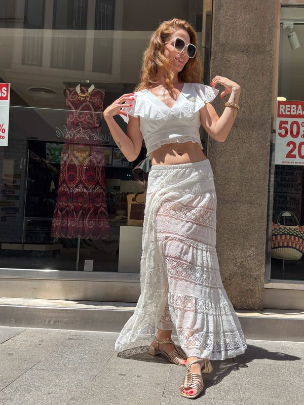 Falda larga de encaje transparente, con culote. Goma en cintura.