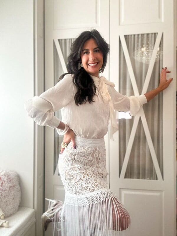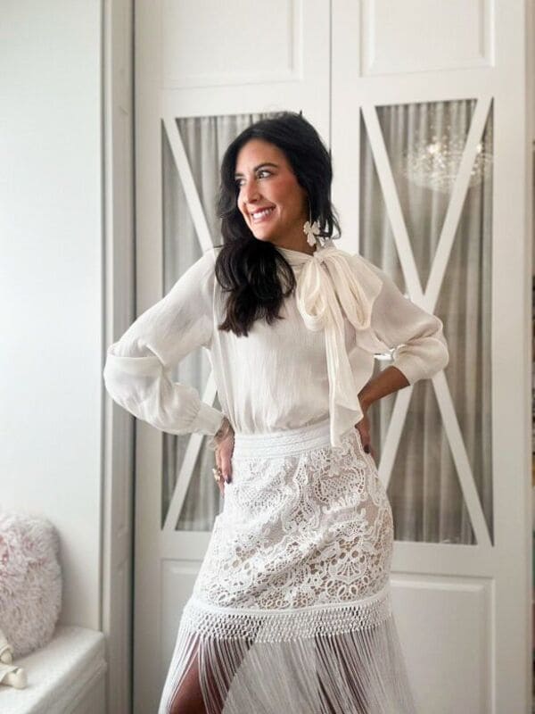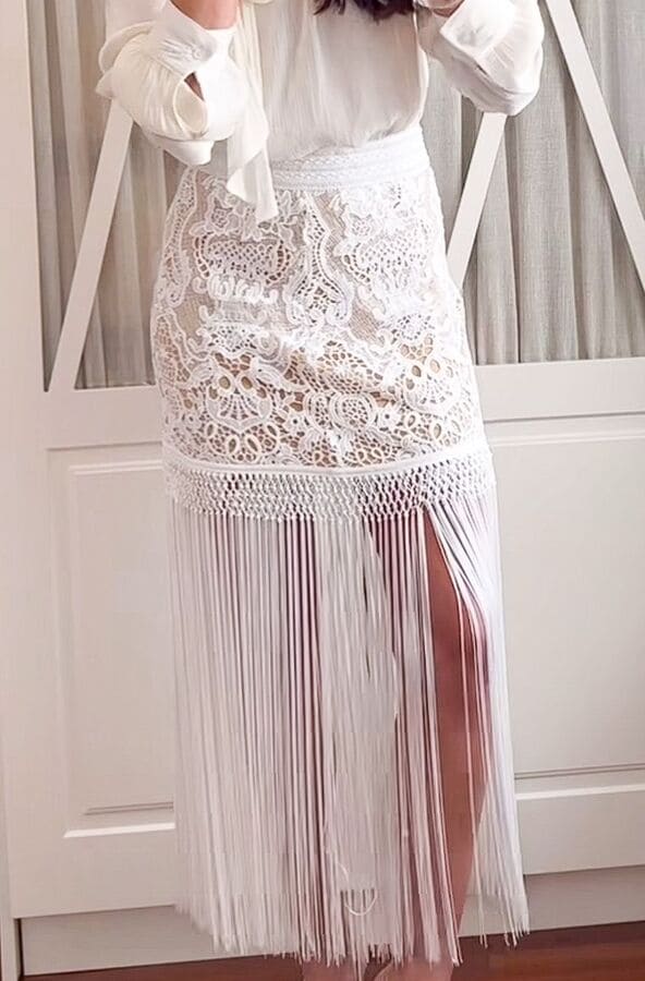 Falda larga de encaje beige, flecos largos. Goma elástica, cremallera lateral invisible.