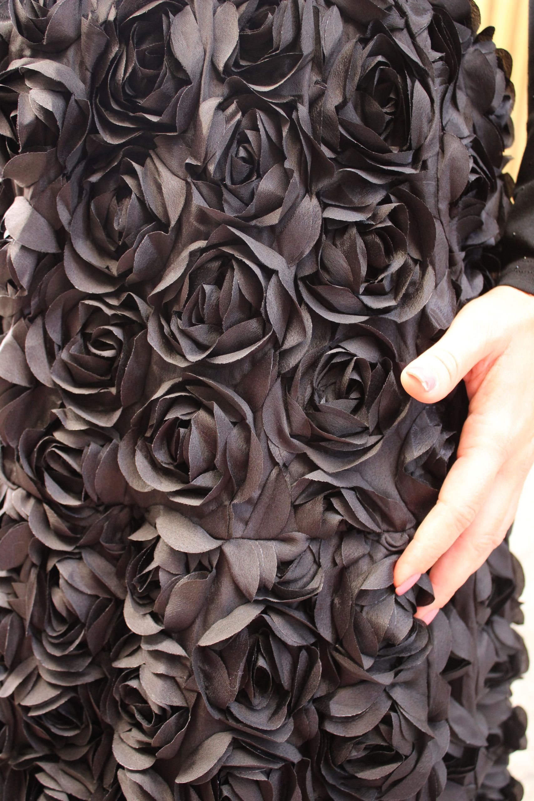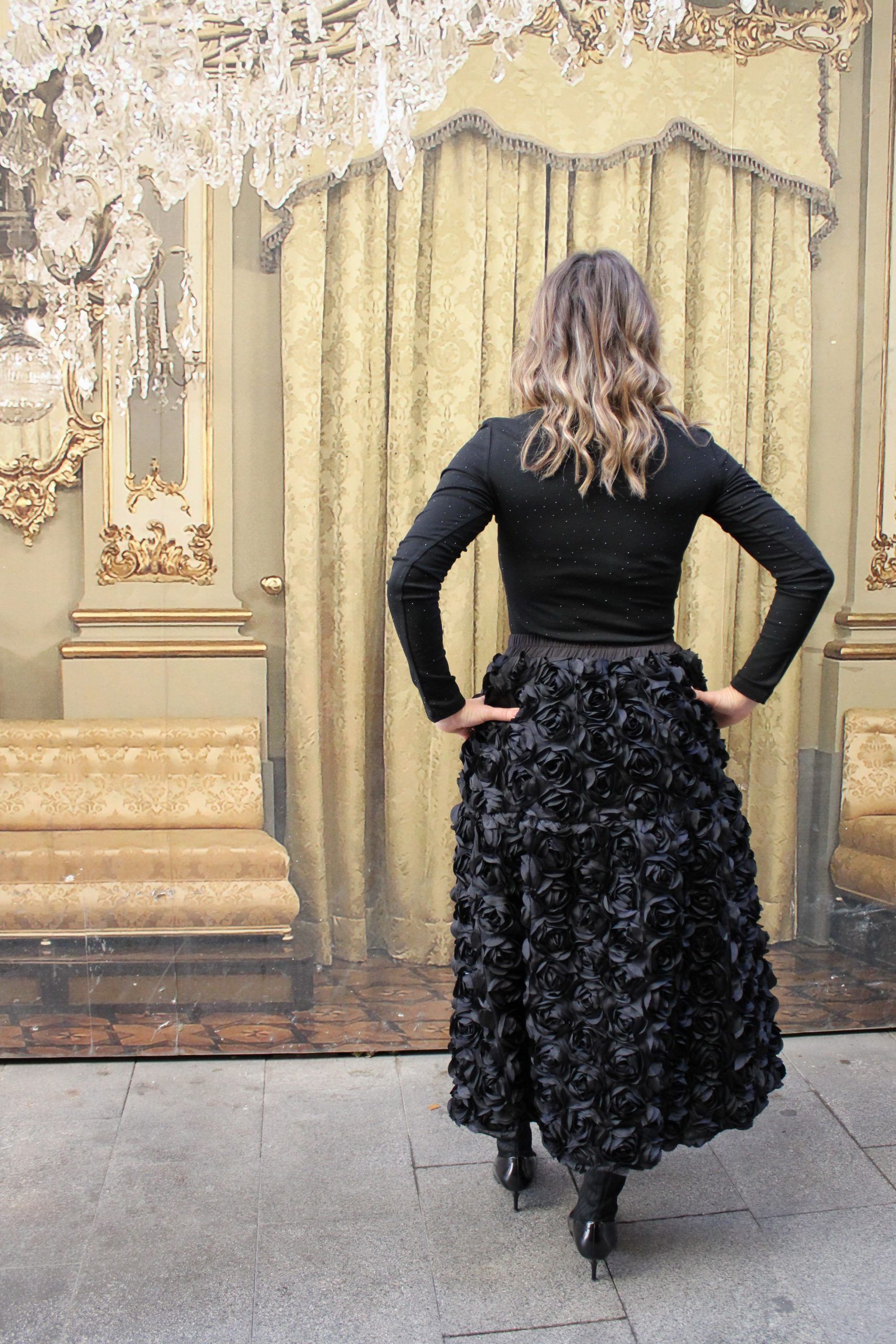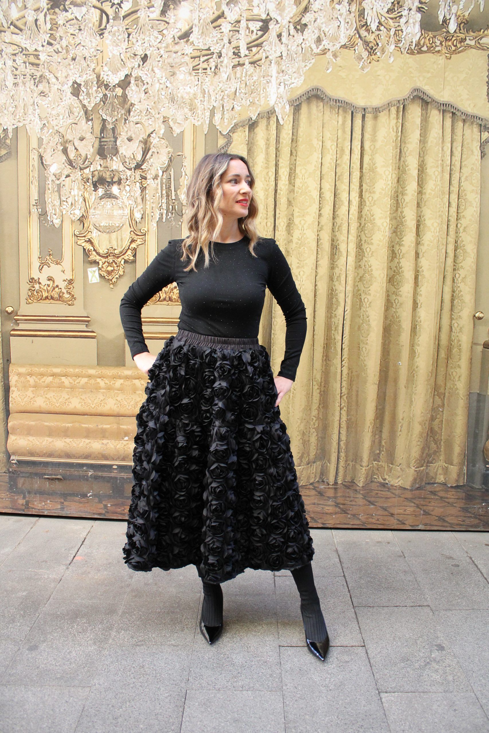 Falda negra, flor en relieve. Goma en cintura, bolsillos laterales, corte en cintura. Forro al tono.