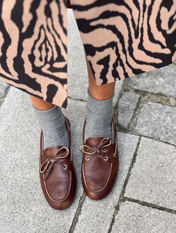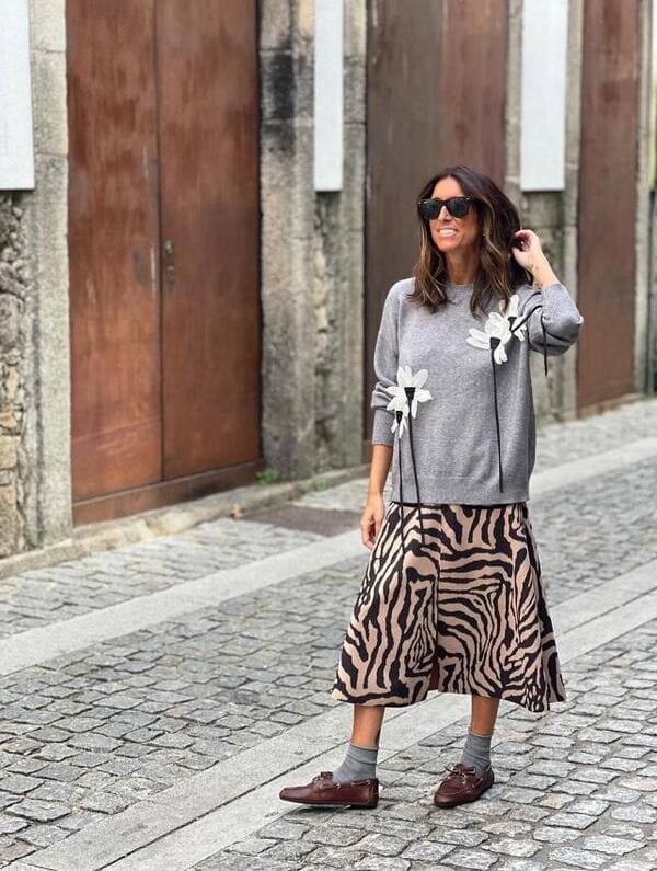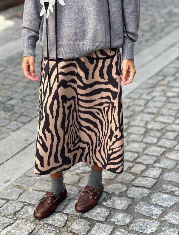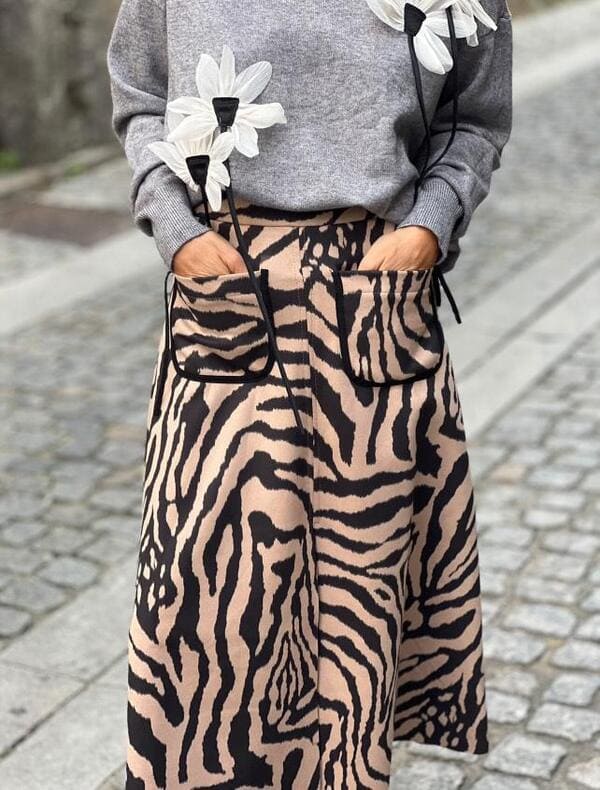 Falda print cebra, negro y beige. Corte evasé, bolsillos delanteros ribeteados en negro. Abertuta delantera.