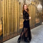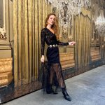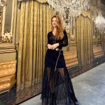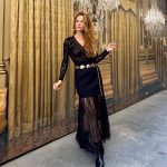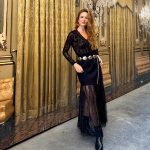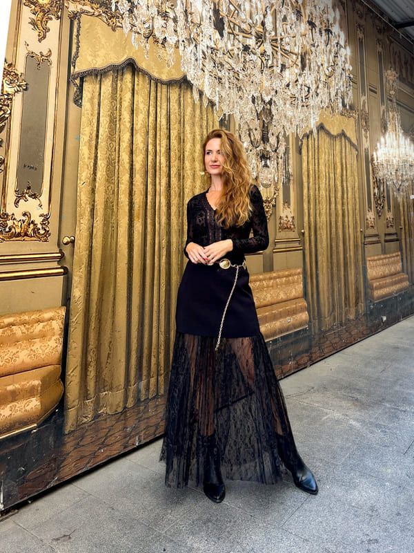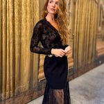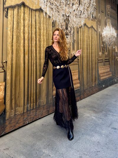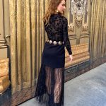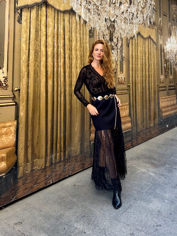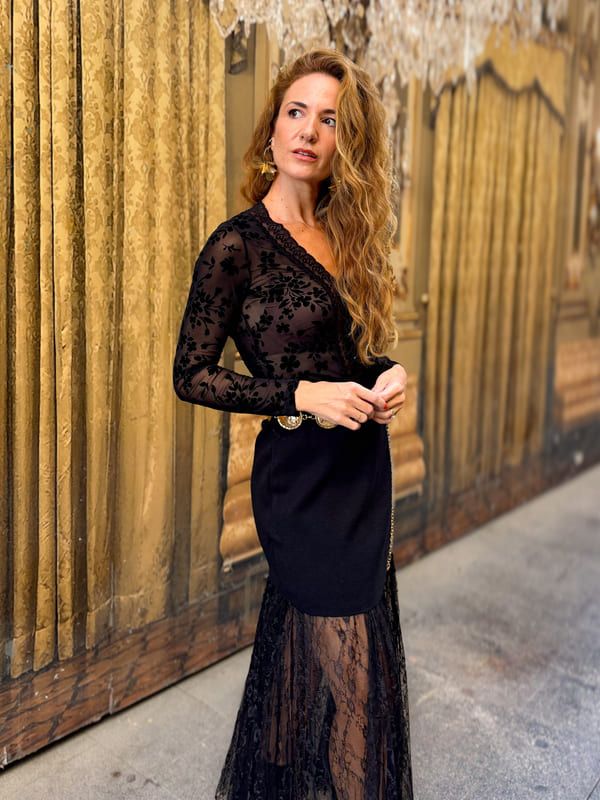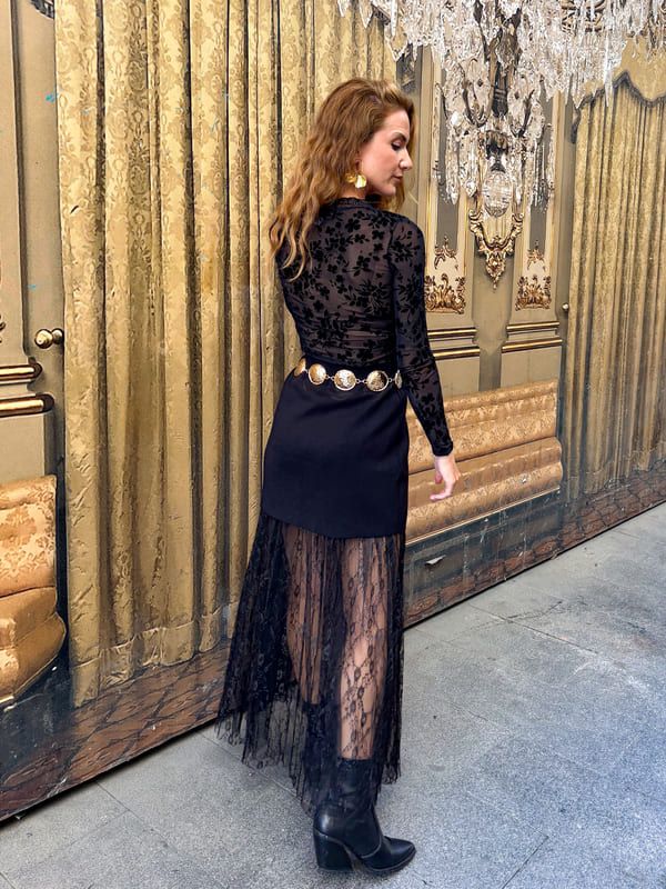 Falda larga negra, de punto y encaje. Goma en cintura.