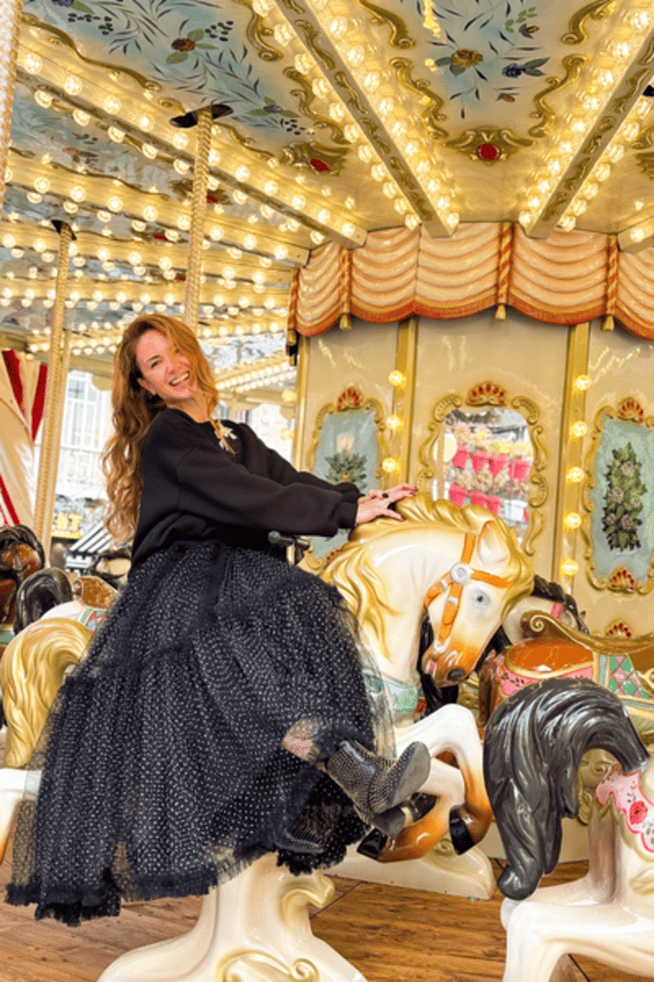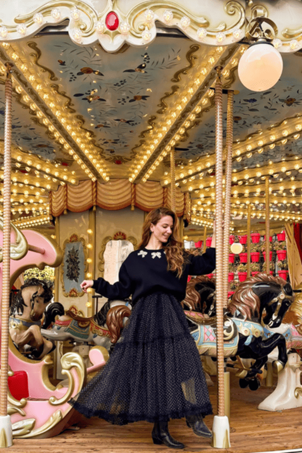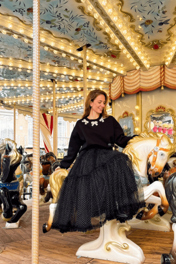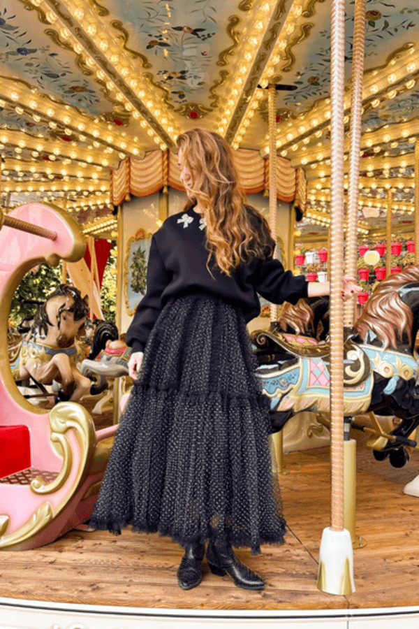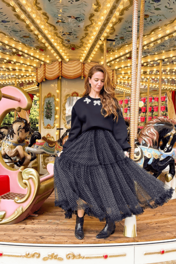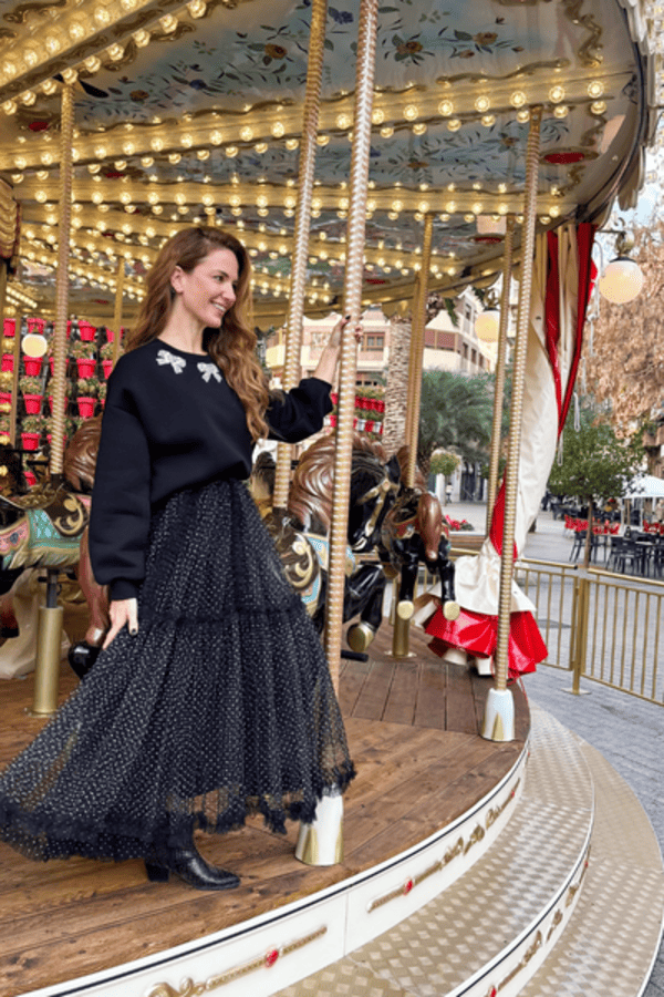 Falda larga tul, cintura elástica. Estampado de topos blanco y negro. Forro al tono.