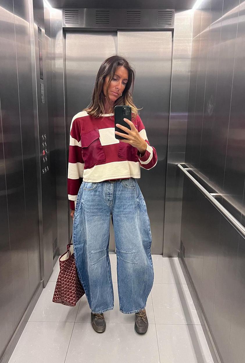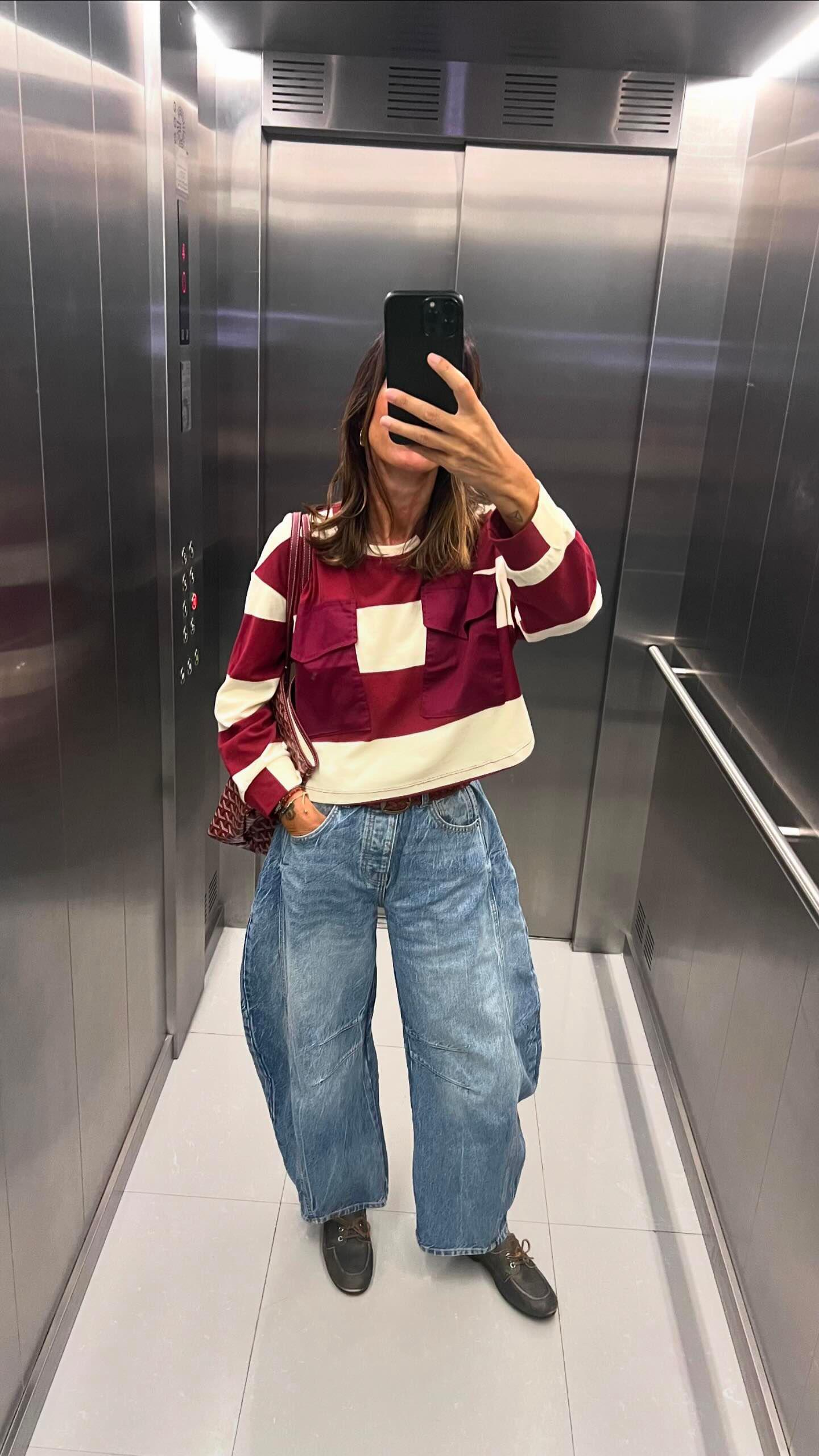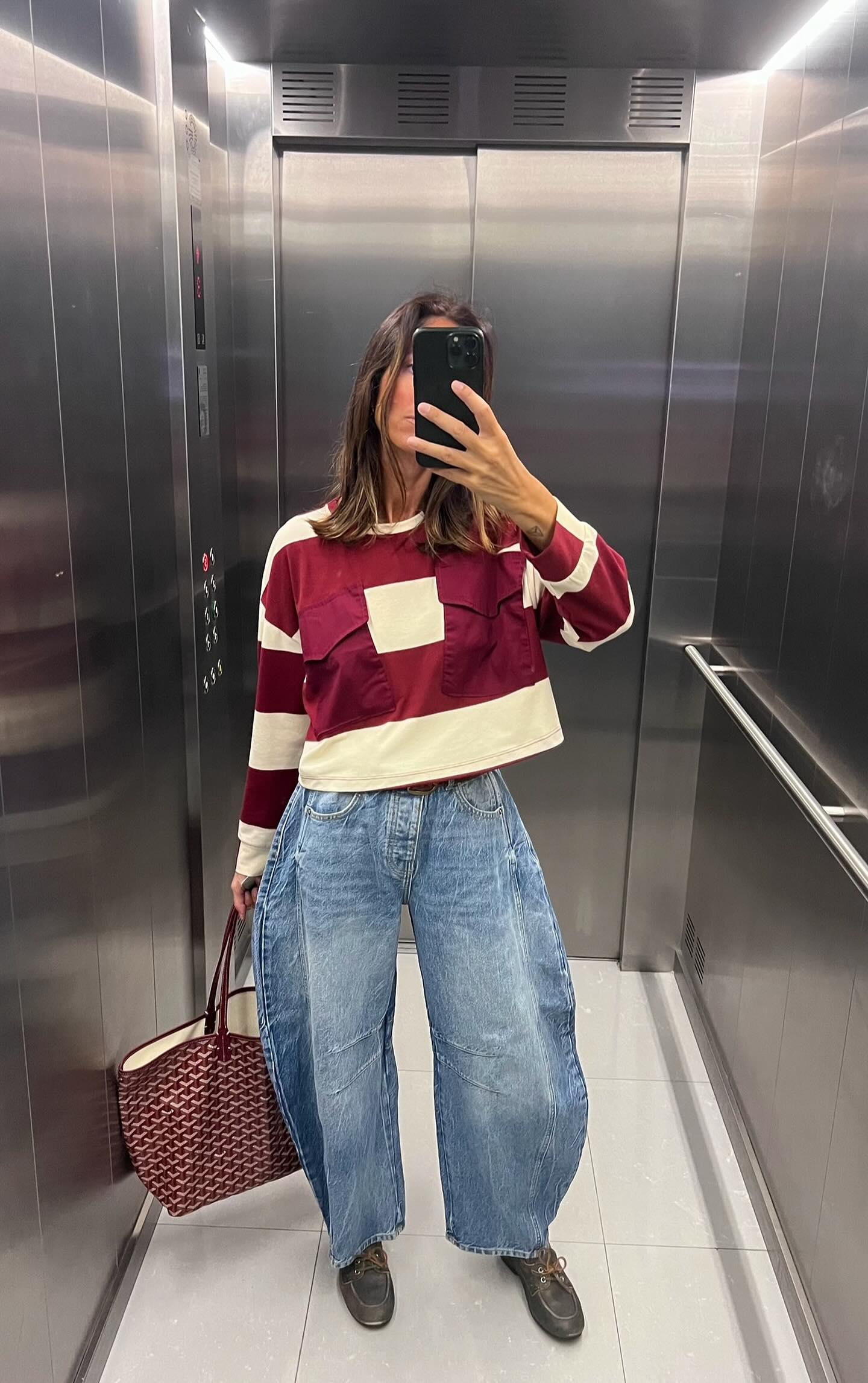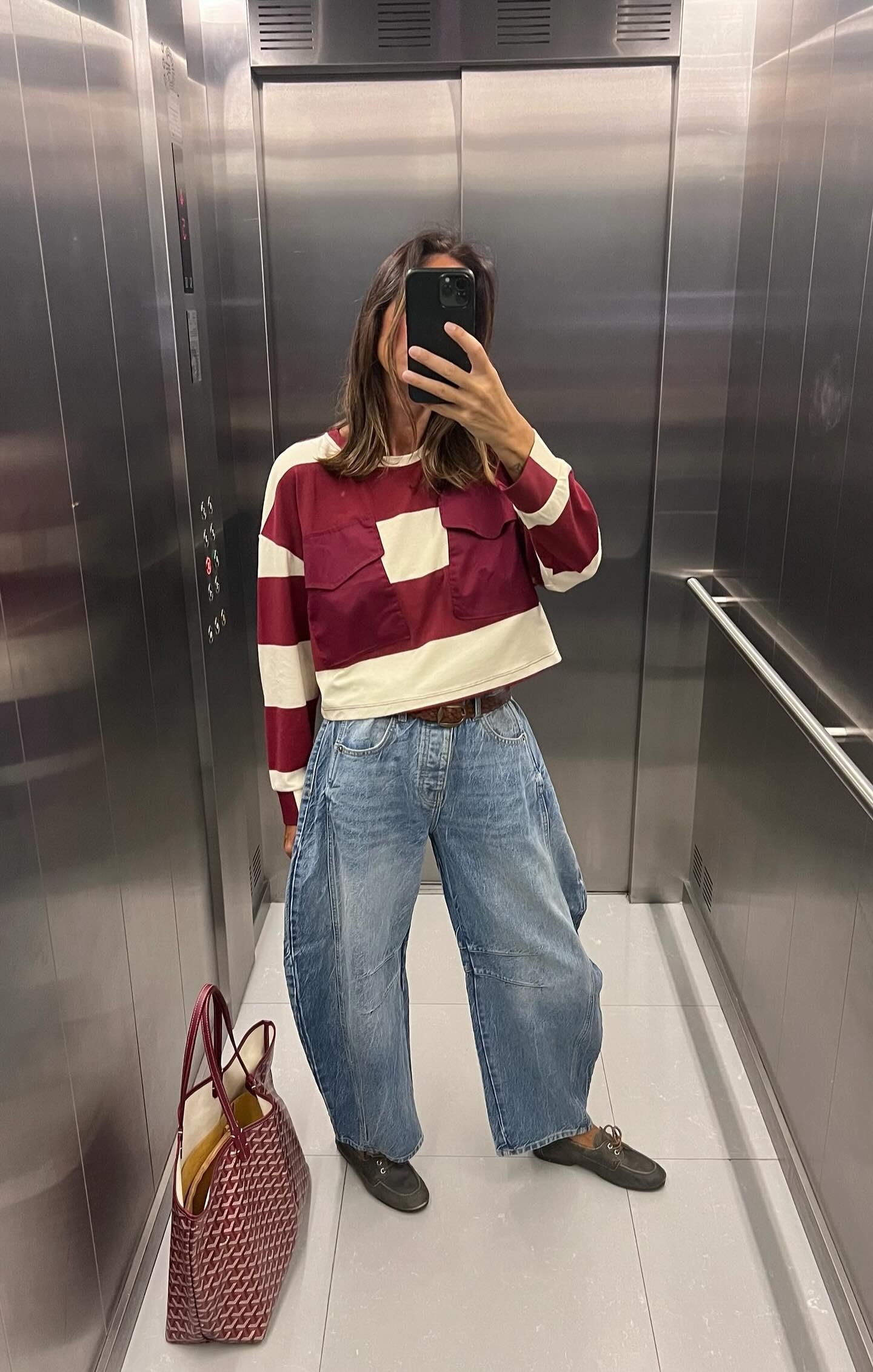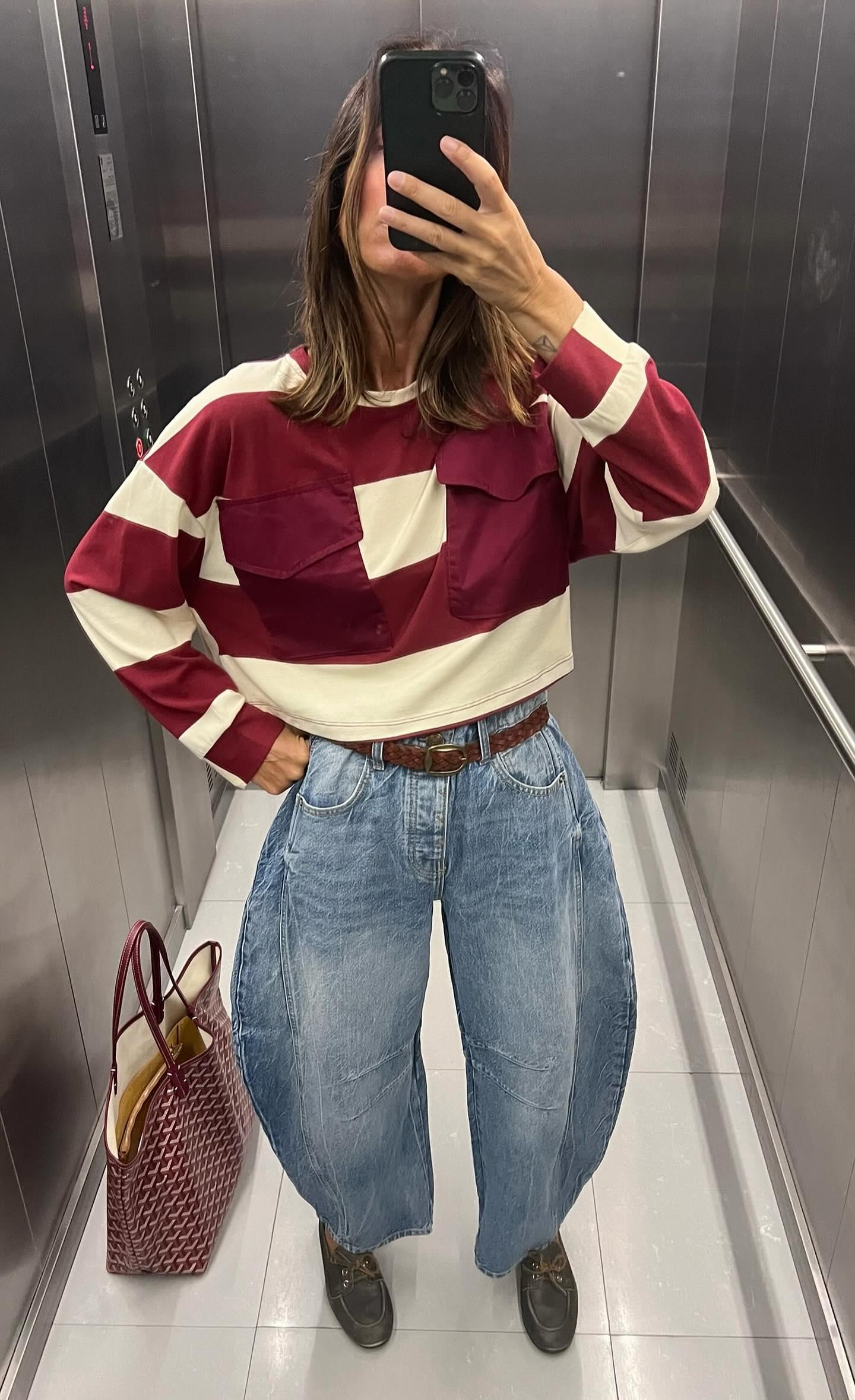 Jersey mini rayas beige y burdeos. Bolsillos delanteros, cuello redondo, manga larga.