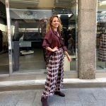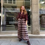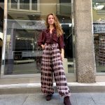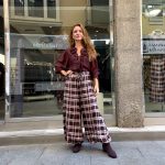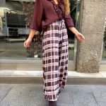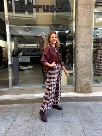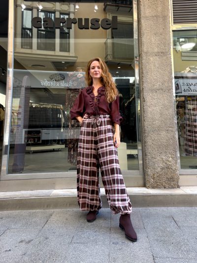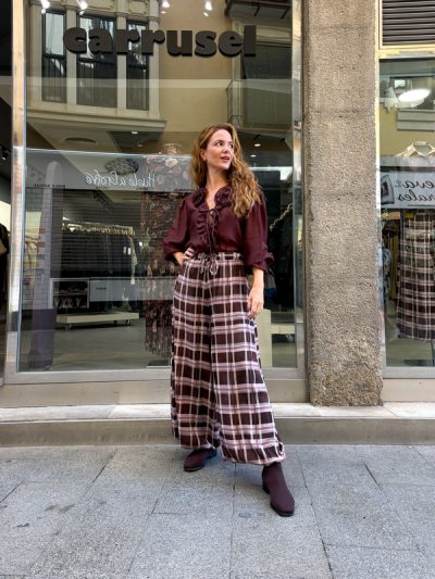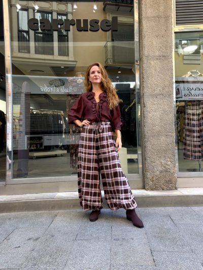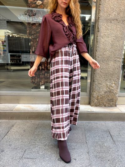 Pantalón cuadros rosa y marrón, goma en cintura y lazada. Bajo bombacho. Forro interior.