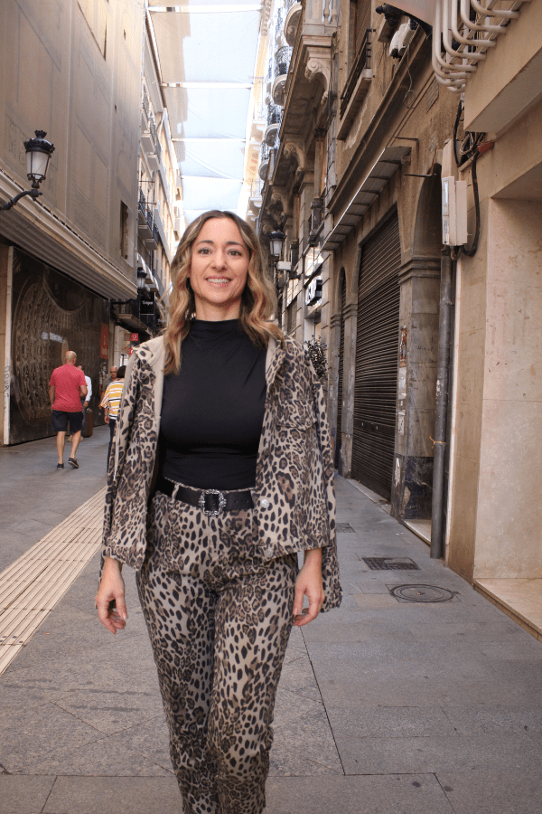 Pantalón print, marrón y beige. Bolsillos delanteros, cierre con botón y cinturón negro.