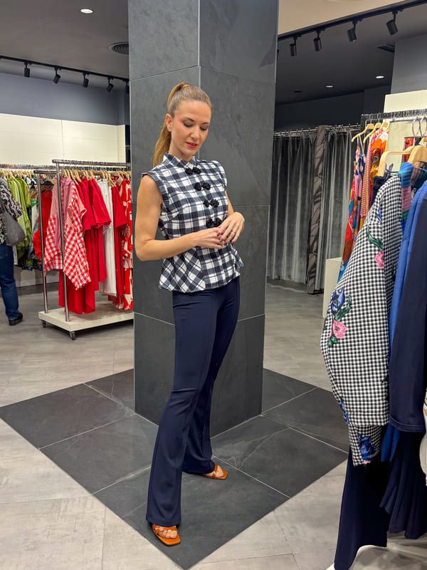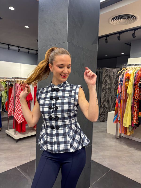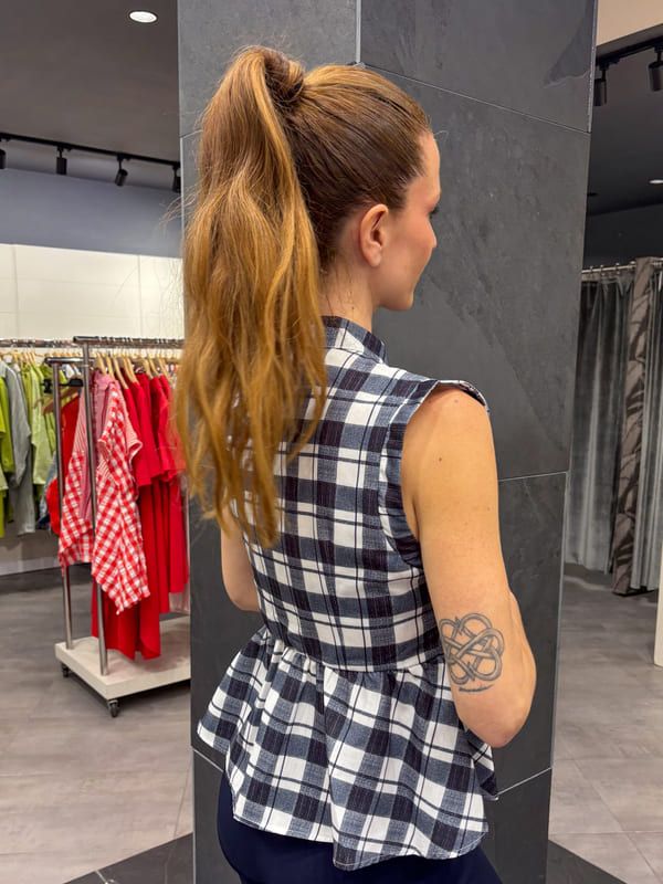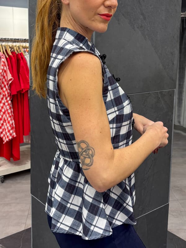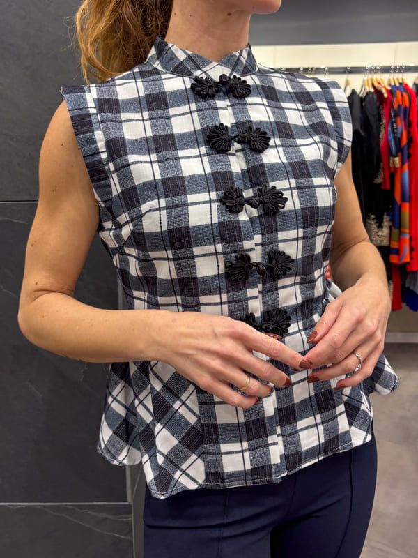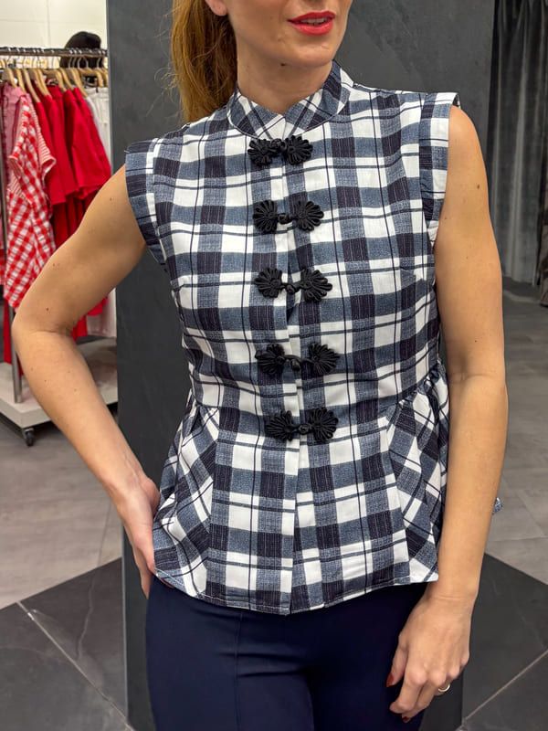 Top cuadros azules y blancos, cuello mao, sin manga. Cierre con pasamaneria negra, corte peplum.