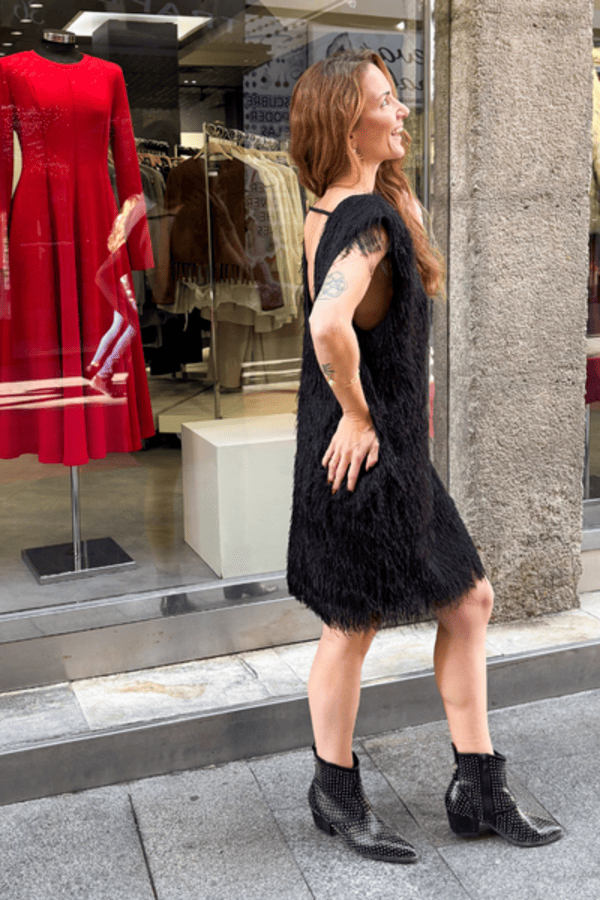 Vestido corto negro con flecos. Cuello redondo, sin manga y espalda descubierta.