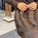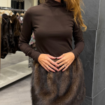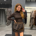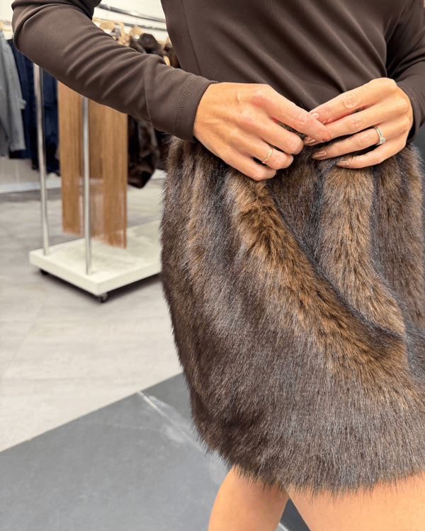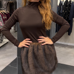 Vestido marrón manga larga, con pelo falda. Cierre posterior con botones.