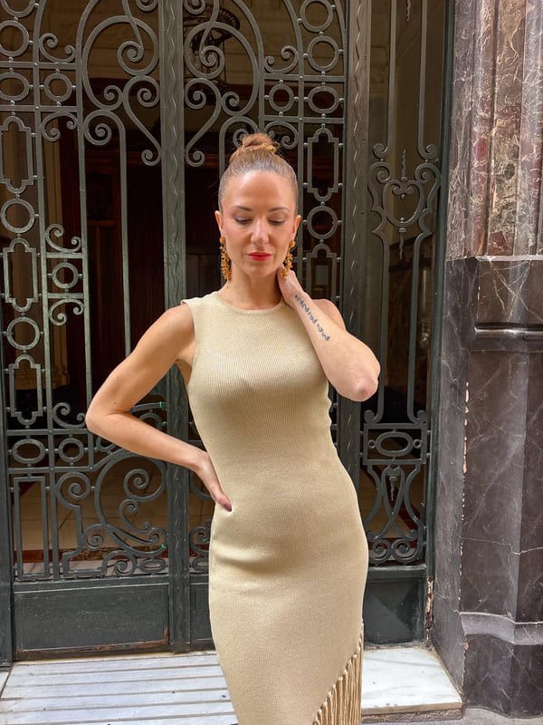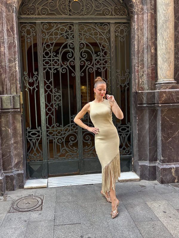 Vestido de punto dorado con flecos. Cuello redondo, sin manga. Bajo asimétrico.