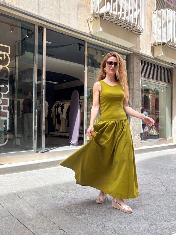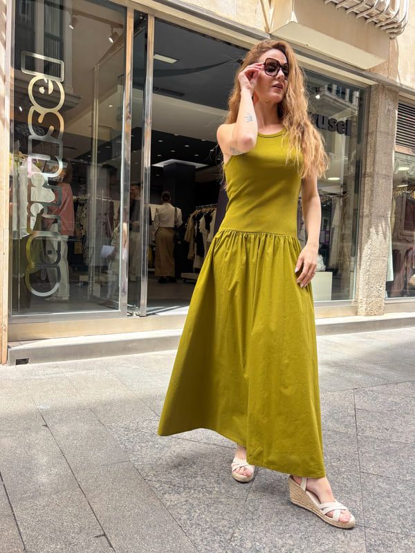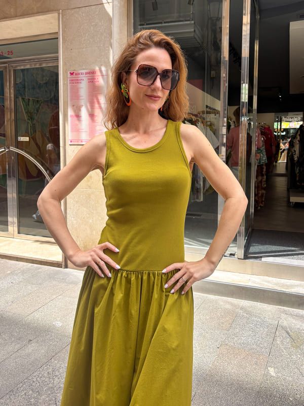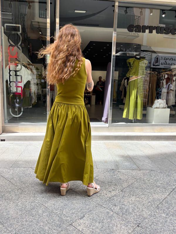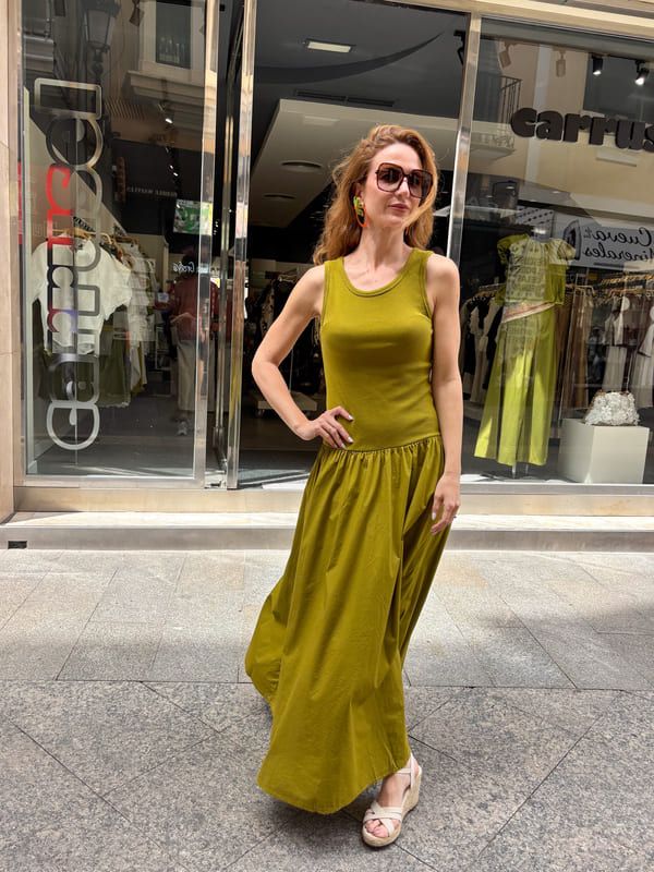 Vestido largo verde oliva. Parte superior de camisesta, cuello redondo y sin manga. Falda con vuelo y bolsillos laterales.