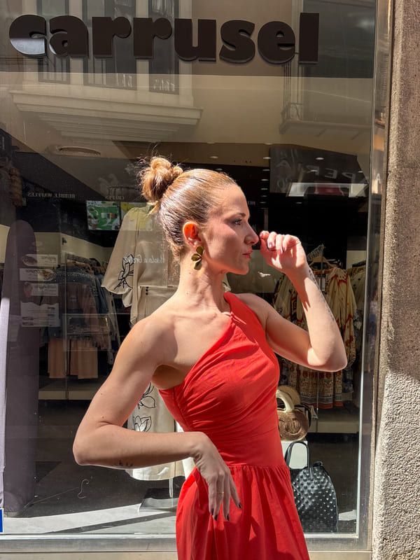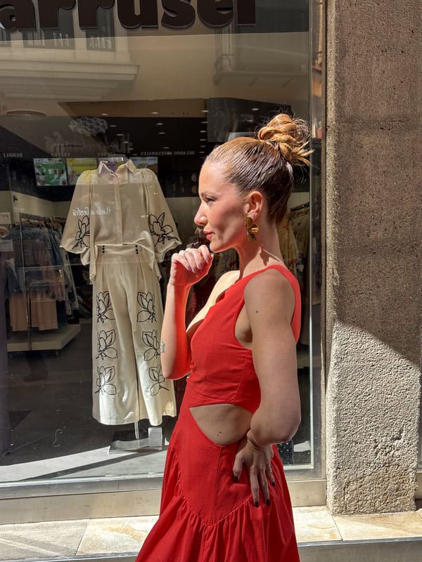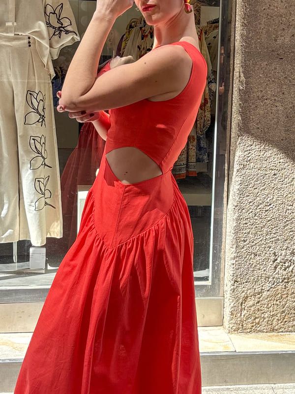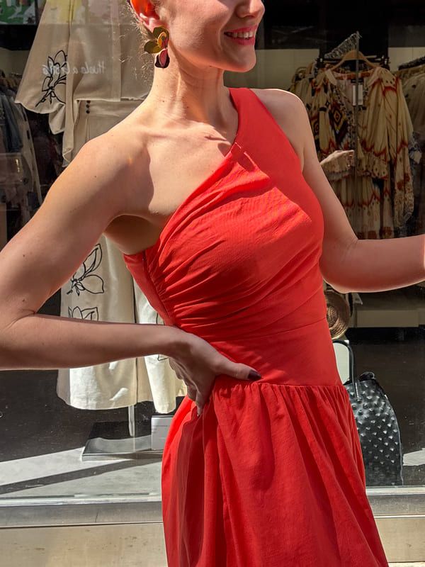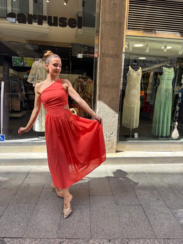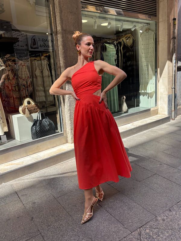 Vestido midi cut out, cuello asimétrico y manga sisa. Corte en la cadera, cierre con cremallera invisible. Forro al tono.